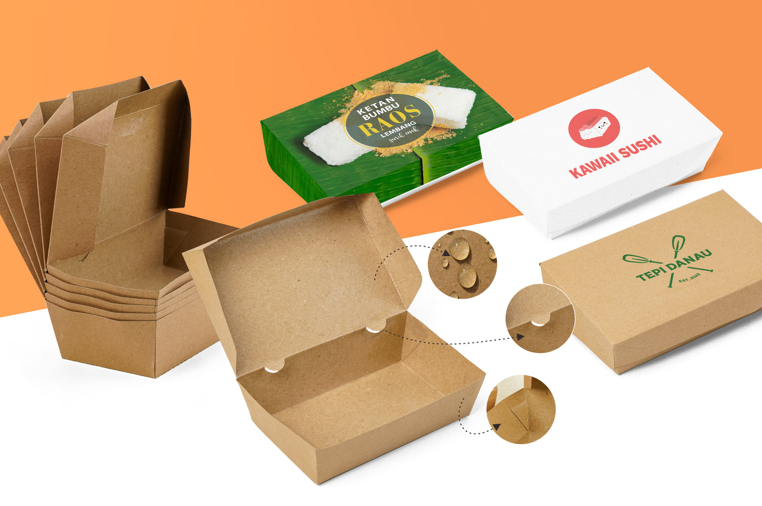 Saat ini Anda bisa custom 2 tipe kemasan box yaitu FULL CUSTOM atau READY+ LOGO. Selain itu, Anda bisa custom CUP GELAS, BOWL, dan juga LUNCH BOX FORMING.