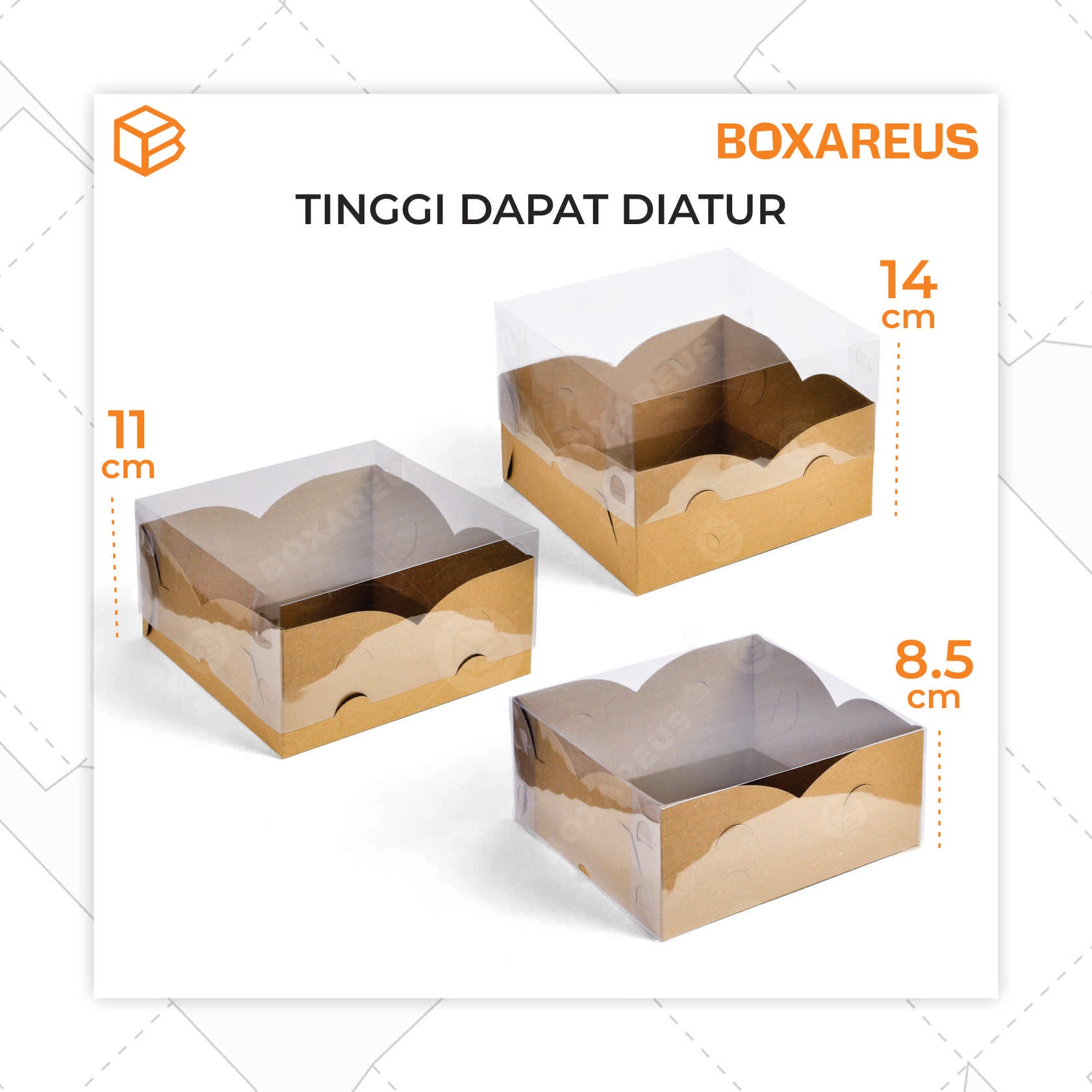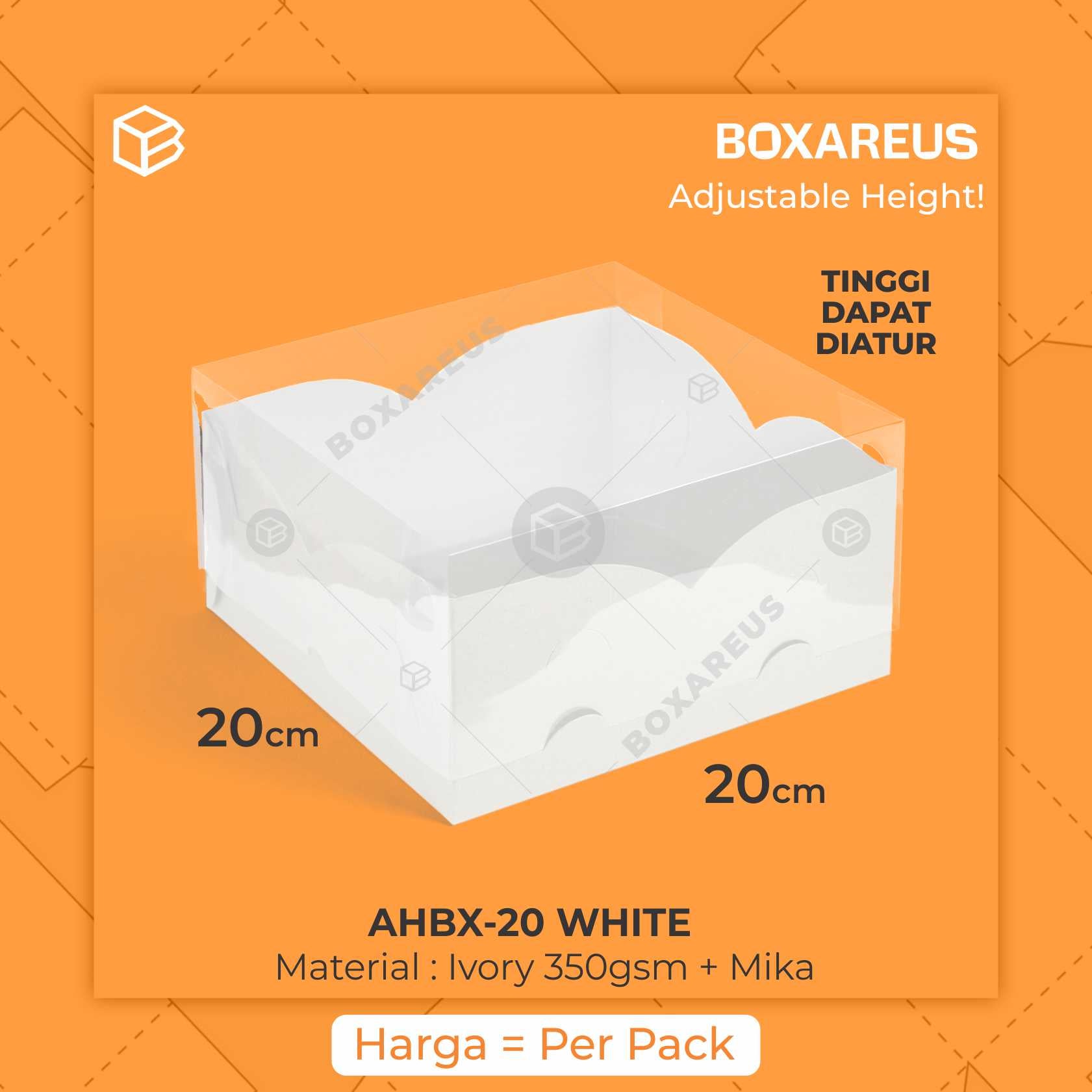 Box 20 x 20 cm Adjustable Height. Box Kue kombinasi bahan Kraft + Mika ukuran 20cm dengan ketinggian yang dapat diatur sesuai kebutuhan anda. Cocok untuk mengemas produk anda yang tingginya variatif.