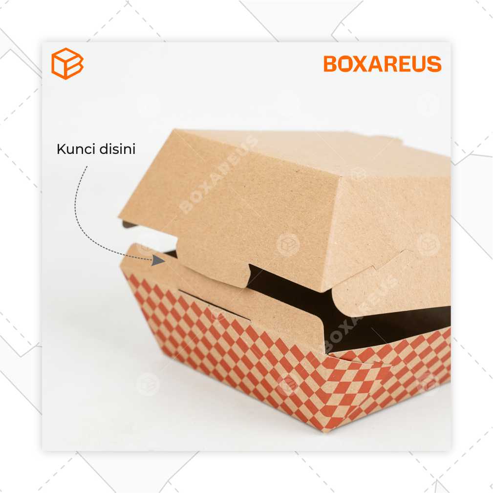 Box Multifungsi untuk takeaway/dine-in ini bisa kamu atur tampilannya sesuai kebutuhan dan seleramu (corak bisa menghadap atas atau bawah). Bagian dalam sudah laminasi sehingga tidak mudah rembes minyak, butter, atau mentega. Cocok untuk mengemas burger, dimsum, takoyaki, siomay, sausages & french fries, chicken popcorn, dll