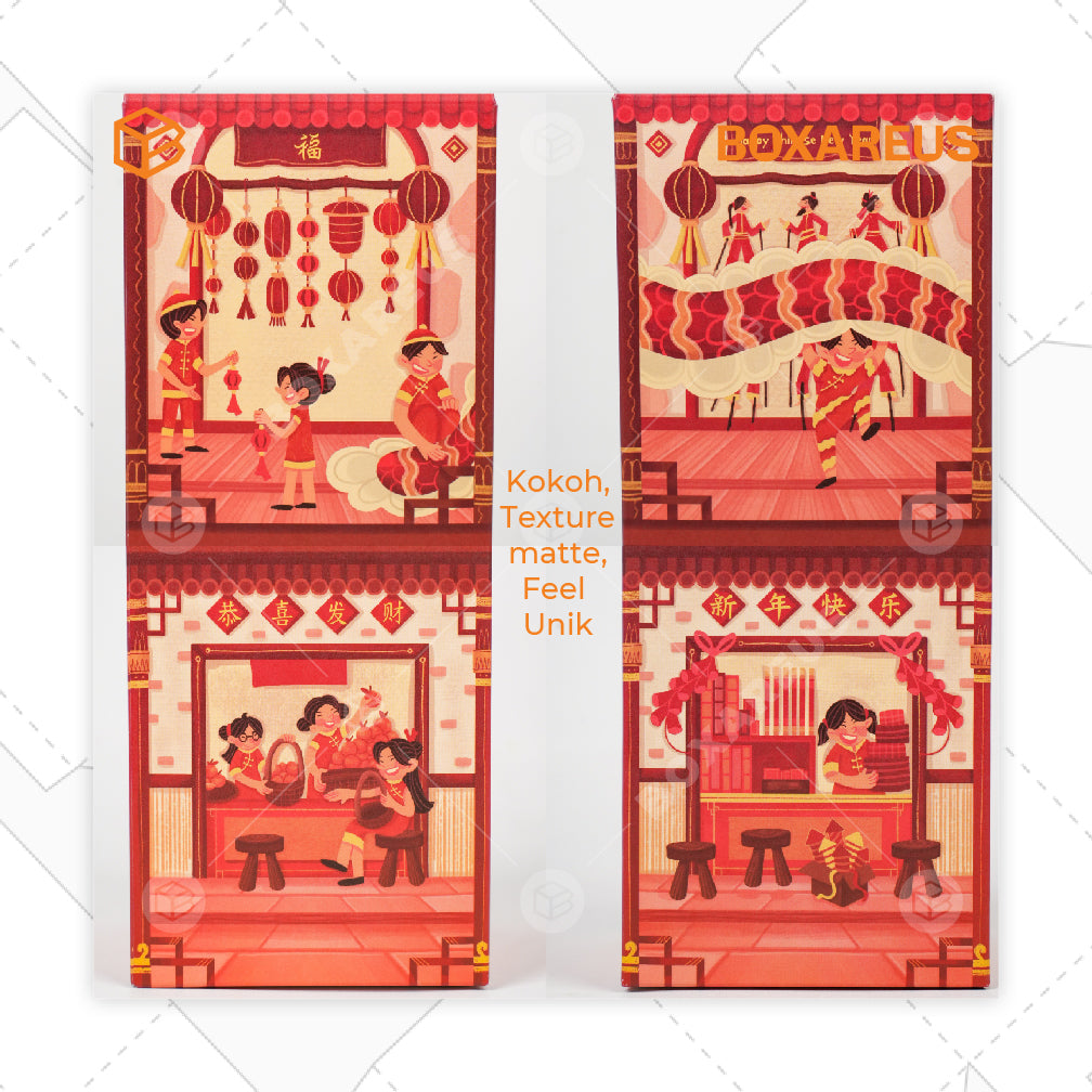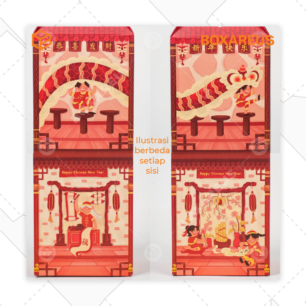 Packaging hampers imlek dengan ukuran best seller yang cocok untuk berbagai produk dalam satu kemasan. Berilustrasi hangatnya momen persiapan imlek, dan memiliki tekstur bahan yang matte semakin membuat packaging ini diminati. Ukurannya yang tinggi dapat menghemat tempat saat mempersiapkan hampers.