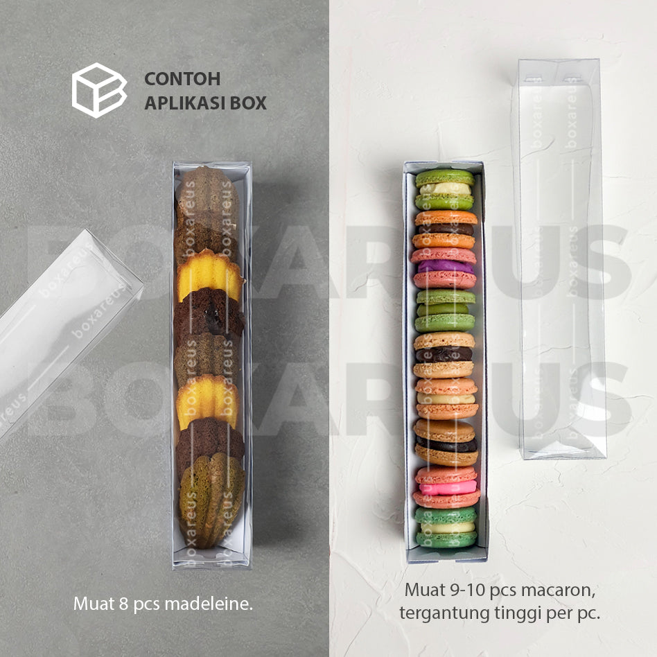 Window Box multifungsi dan universal, dapat digunakan untuk berbagai diameter/tinggi macaron. Full window display siap mendukung cerahnya kreasi macaron-mu.
