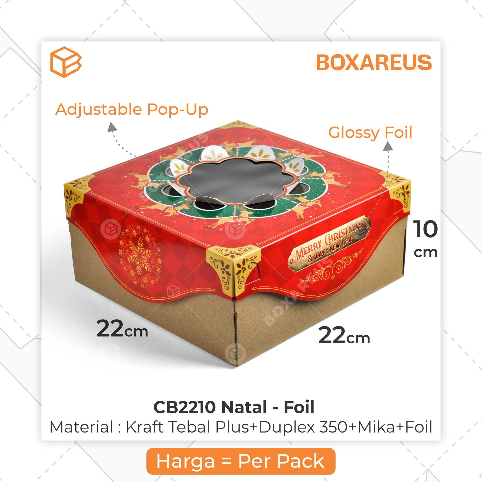 Cake Box dengan desain tutup box bernuansa natal serta kombinasi warna Natal memberikan kesan mewah dan elegan untuk memeriahkan perayaan akhir tahun dan mempercantik Hampers Natal-mu. Cocok untuk mengemas aneka cake/ kue, bolu, marmer cake, tart, chiffon, kue lapis legit. Bisa juga digunakan sebagai gift box, toples box, atau hampers natal lainnya.