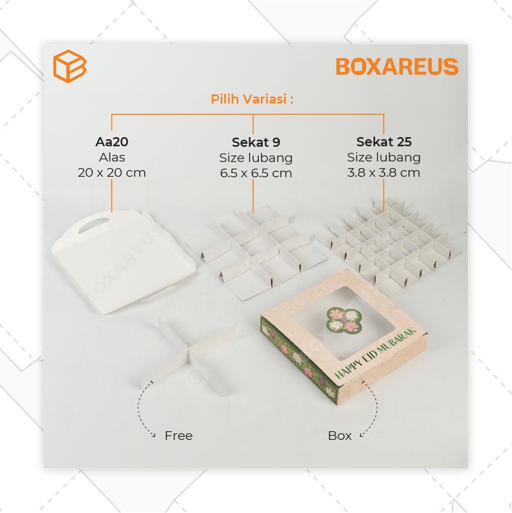 Box multifungsi bertema Lebaran ini cocok untuk untuk kebutuhan hampers yang estetik dan juga fungsional. Dilengkapi bukaan belakang, memudahkan proses masuk-keluar (geser) produk. Desain box berilustrasi tema nuansa floral lebaran, jendela besar & luas 13x13cm, dan sentuhan glowing green foil. Bisa dipercantik dengan tassel & pita satin, untuk mempercantik hampersmu. Sangat cocok untuk mengemas hampers seperti nastar, lapis legit sekat, brownies sekat dan hampers Lebaran lainnya. Bisa di mix & match dengan alas/ sekat sesuai kebutuhanmu.