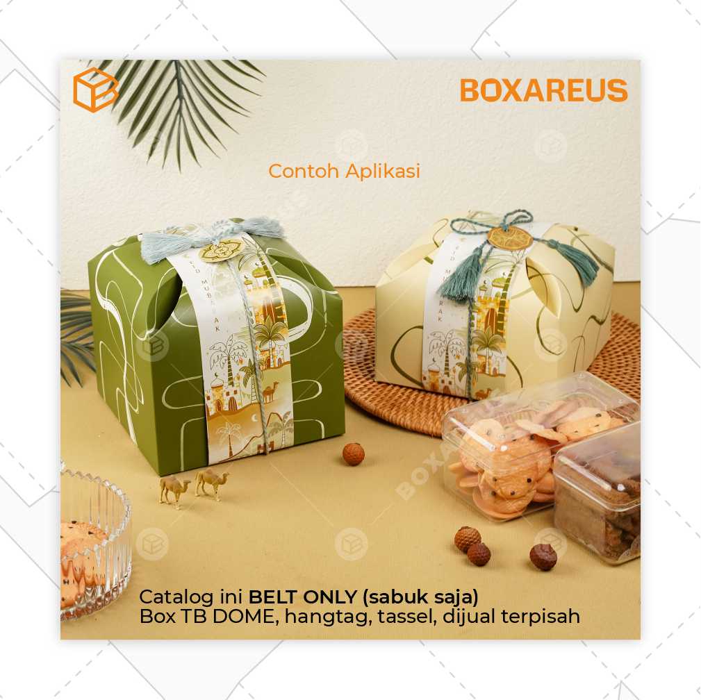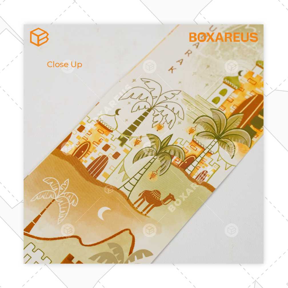Paperbelt tema Idul Fitri ini hadir dengan desain gambar pemandangan gurun yang indah dan menawan. Dengan warna dasar beige yang lembut, memberikan tampilan yang subtle namun tetap mencolok. Teks “Eid Mubarak” memberikan nuansa khas Lebaran. Kombinasi warna yang simple, paper belt ini sangat cocok dikombinasi dengan box polos apapun untuk jadi tema Lebaran, serta memberikan tampilan kontras yang menarik dan sempurna untuk mempercantik hampers Lebaran.
