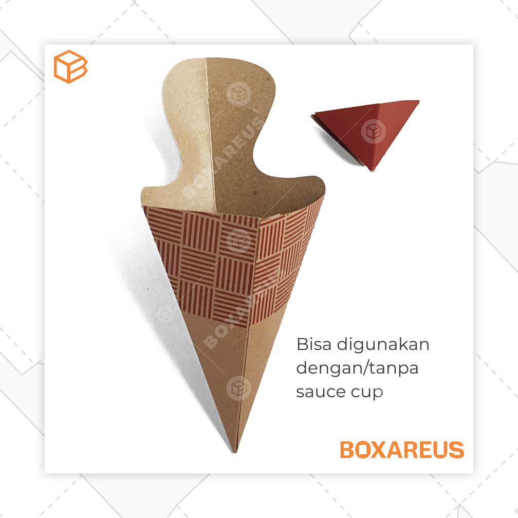 Box cone / kerucut segitiga. Cocok untuk dine-in (makan di tempat), bazaar kuliner, mengemas jajanan seperti Kentang Goreng, Cireng, Kacang, Cimol, Cakue, Churros, Brownie Bites, Sausage Rolls, Karage / Ayam Goreng potong-potong, dll.