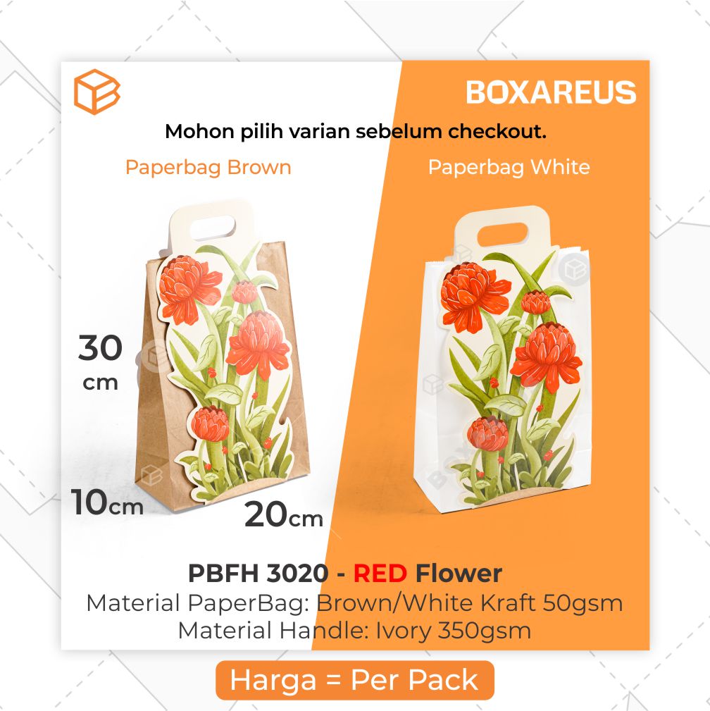 Paper Bag multifungsi dengan desain buket bunga ini memberikan kesan luxury walaupun harganya budget-friendly. Cocok digunakan untuk produk-produk yang cenderung lebih ringan seperti roti, burger, sandwich, kentang, 1-1.5kg cookies (produk makanan), atau produk fashion seperti selendang, mukena, sarung, kain, hijab, baju, dll. Bisa ditambahkan aksesoris yang bisa digantung dibagian handle seperti hangtag, pita, tassel, dll (dijual terpisah).