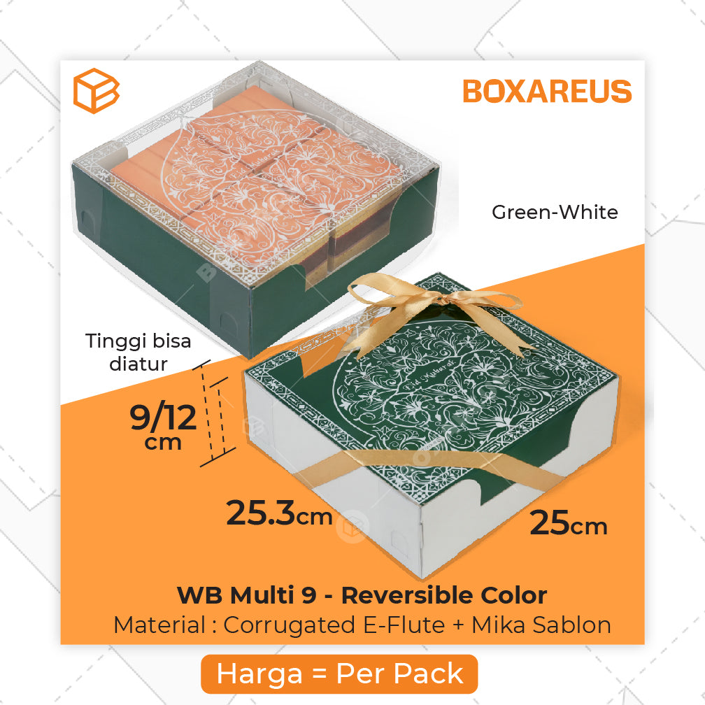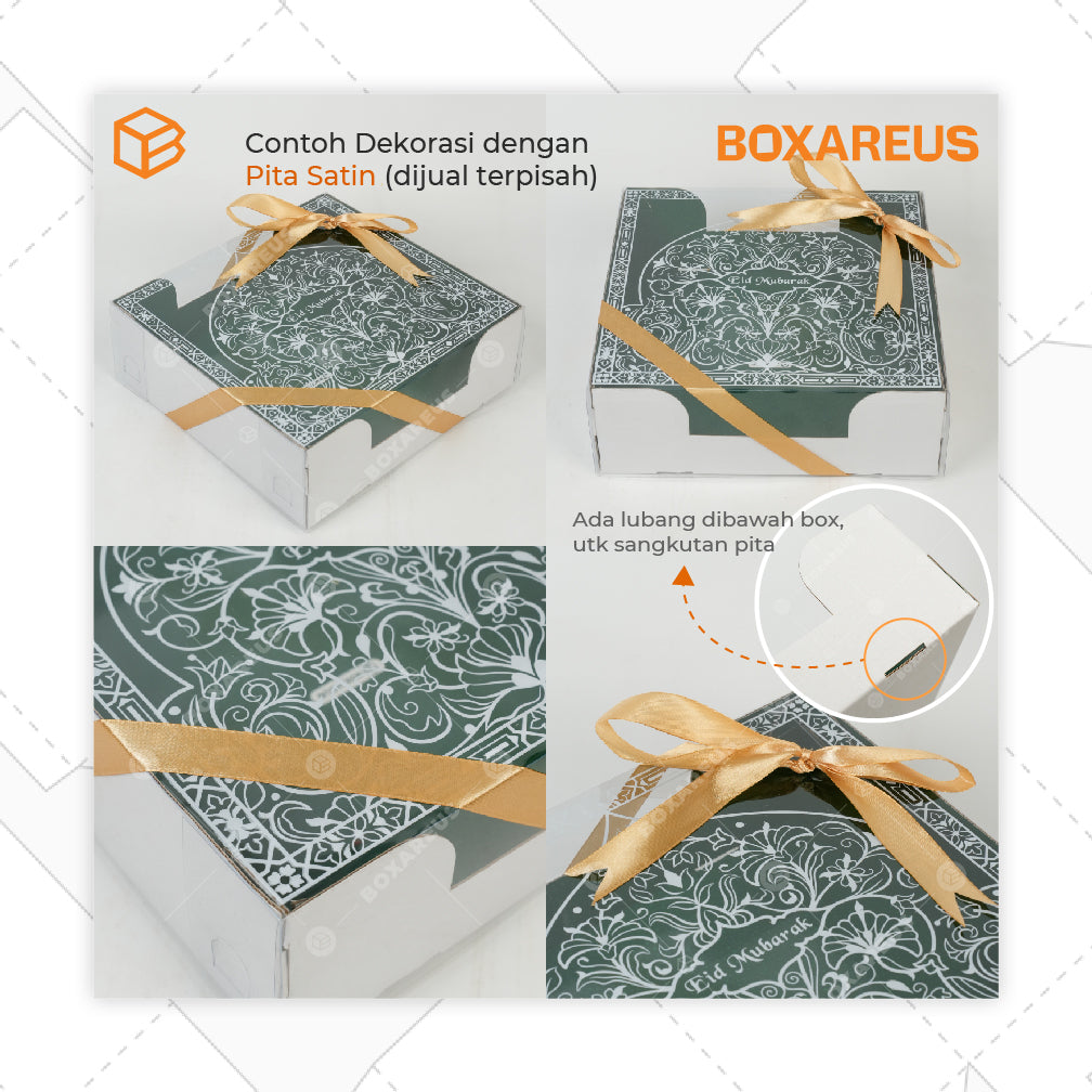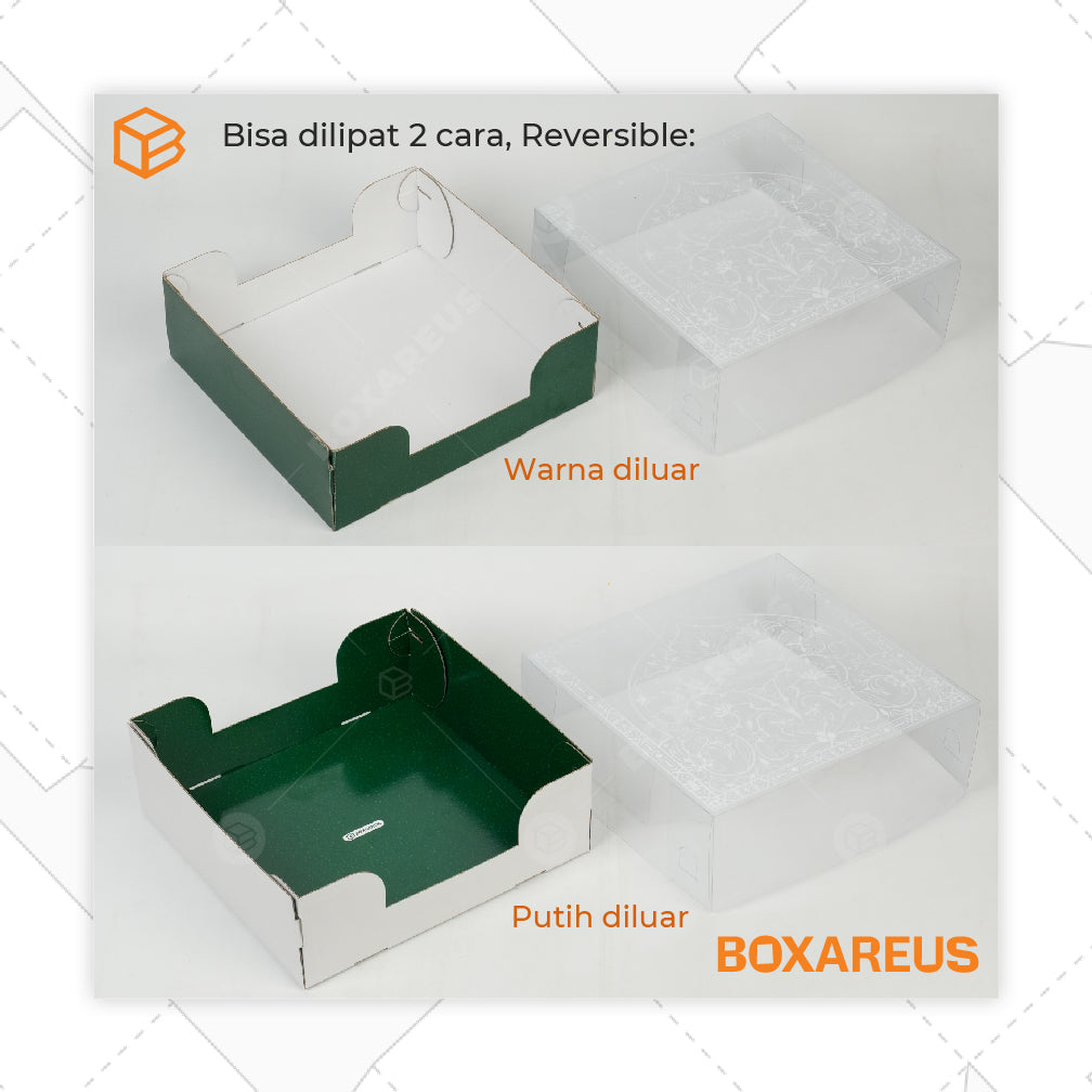 Size: 25 x 25.3 x Tinggi 9 atau 12 cm (tinggi bisa diatur), dengan cara menempelkan tambahan karton ke sudut box (karton peninggi sudah termasuk).
