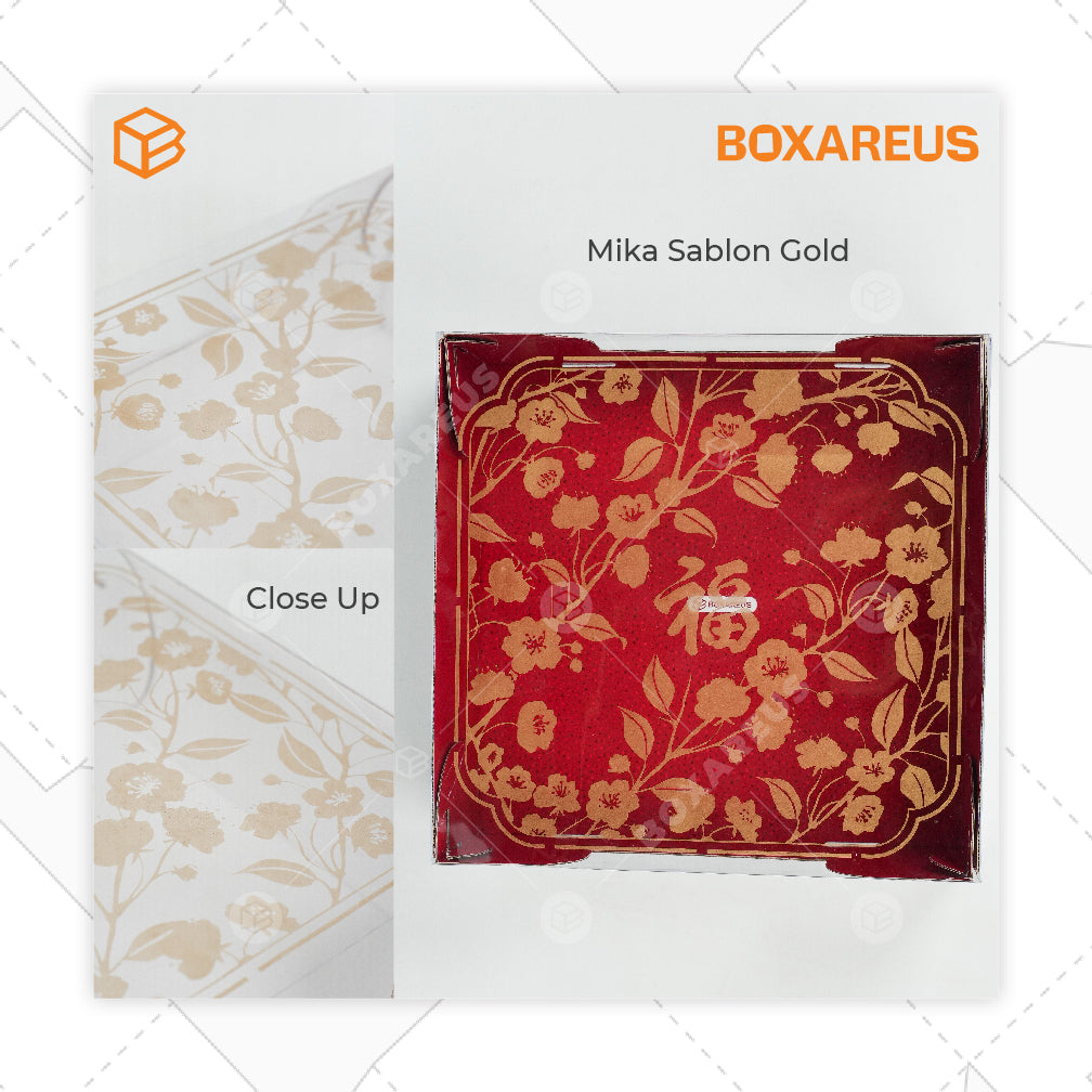 Corak gold di bagian mika dipadukan dengan warna merah box menampilkan elegant, clean, effortless look yang cocok untuk berbagai konsep hampers modern dan ekslusif.