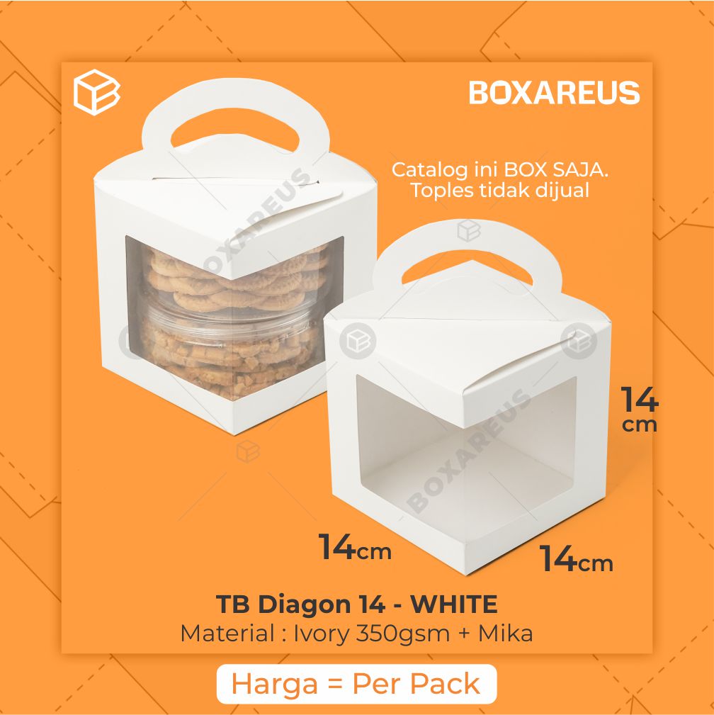 Box bentuk persegi dengan desain gagang diagonal yang unik anti pasaran, hadir dalam 2 warna untuk mengemas 2 toples bulat 500gr (ukuran per 1 toples: diameter maks. 14cm, tinggi maks. 7cm). Gagang nya kuat dan jendela mika nya luas, dapat menampilkan produkmu dengan optimal dan kekinian. Cocok digunakan untuk mengemas toples berisi cookies, kue kering, snack, atau bisa juga dijadikan sebagai hampers, gift box yang berisi boneka kecil, atau kombinasi produk lainnya.