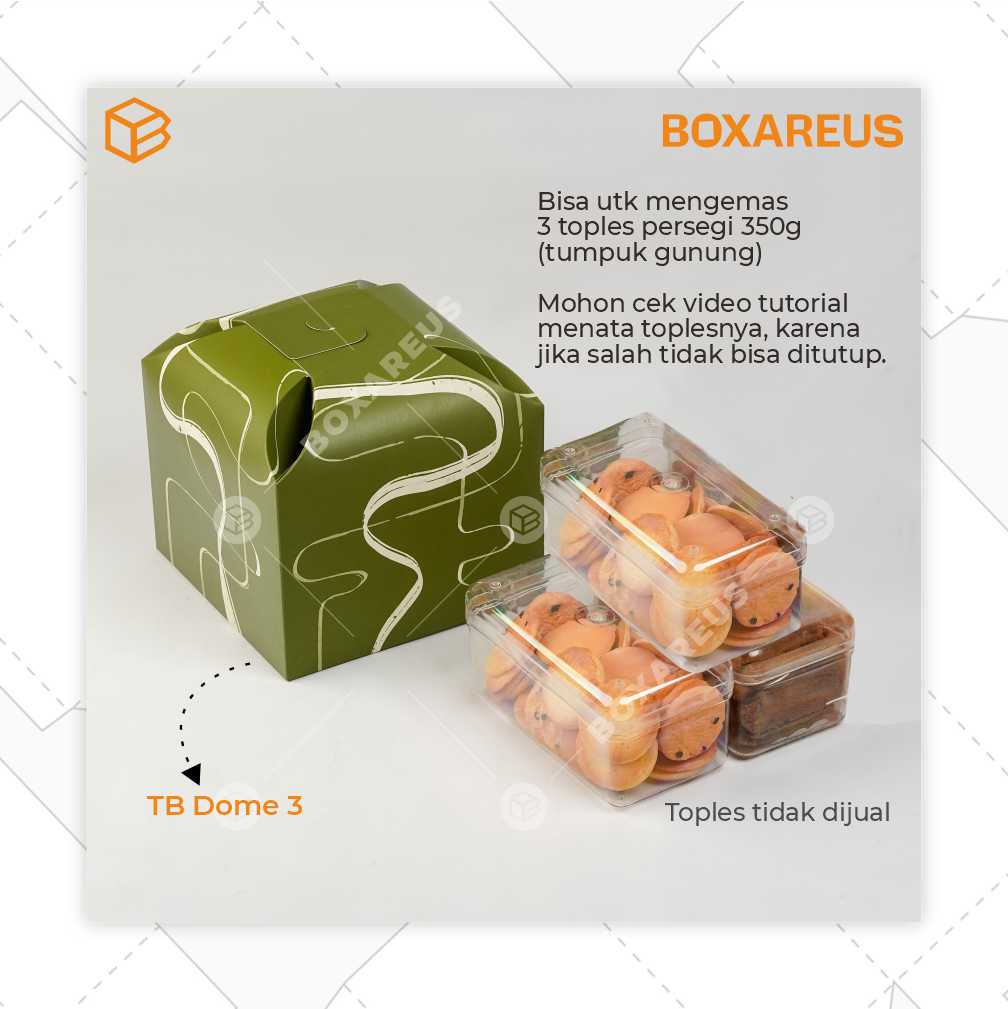 Cocok untuk mengemas 3 toples persegi panjang ukuran 350gr (rekomendasi : hardtop901) dengan cara ditumpuk gunung