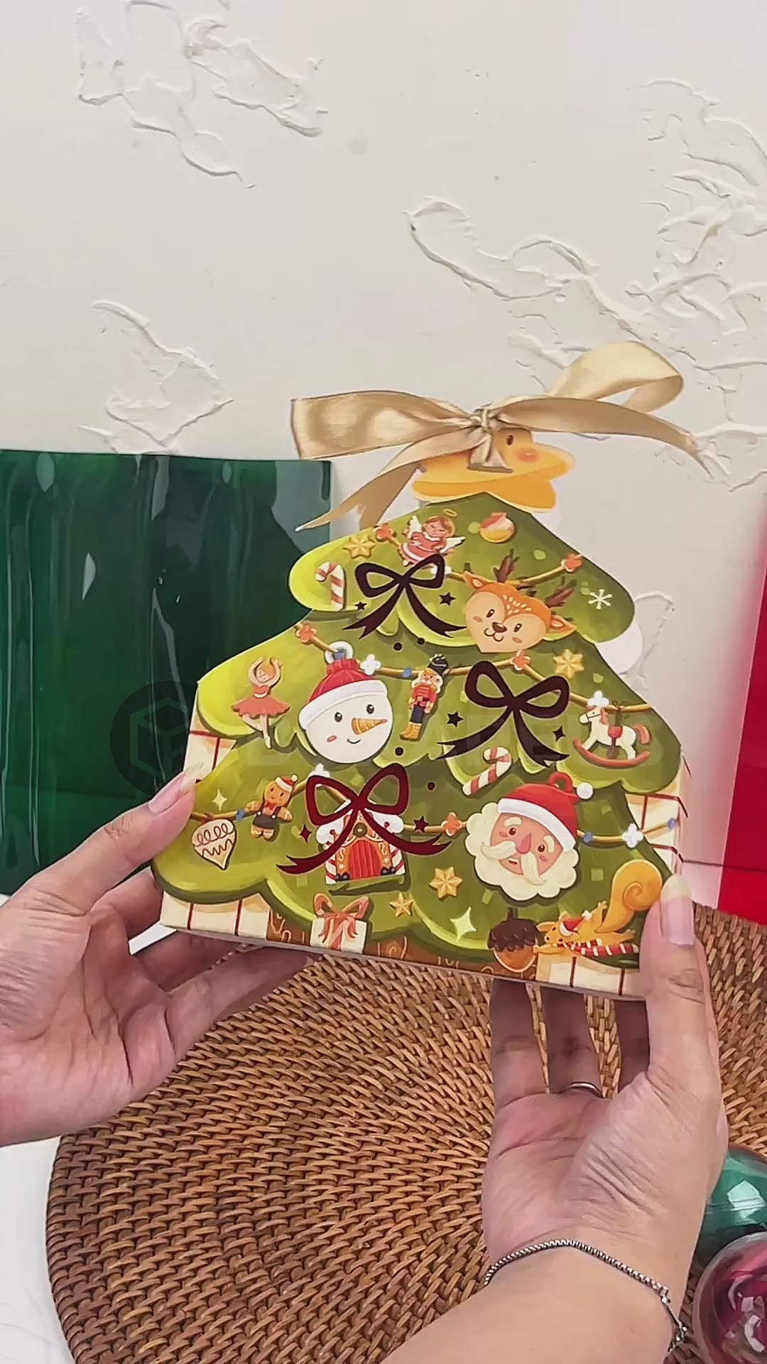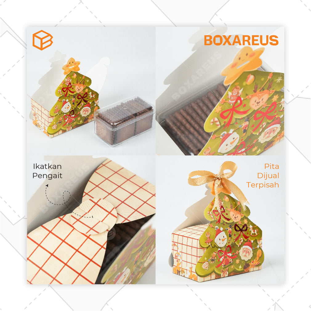 - Direkomendasikan tambahan pita satin warna Red/Green/Gold untuk mengikat bagian atas box.