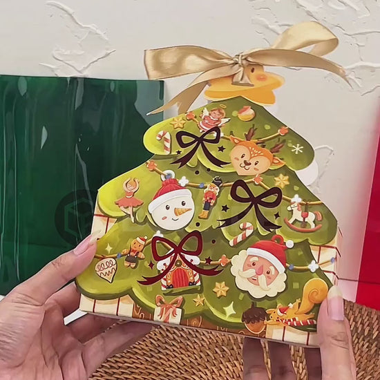 Box hampers dengan bentuk unik ini menyerupai pohon pinus dan berilustrasi ornamen gantungan khas pohon Natal. Dilengkapi detail foil merah mengkilap, membuat kesan box semakin spesial. Box berbahan tebal dengan tekstur yang matte, memberikan tampilan yang kokoh dan mewah.
