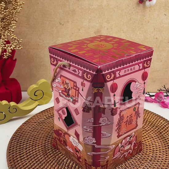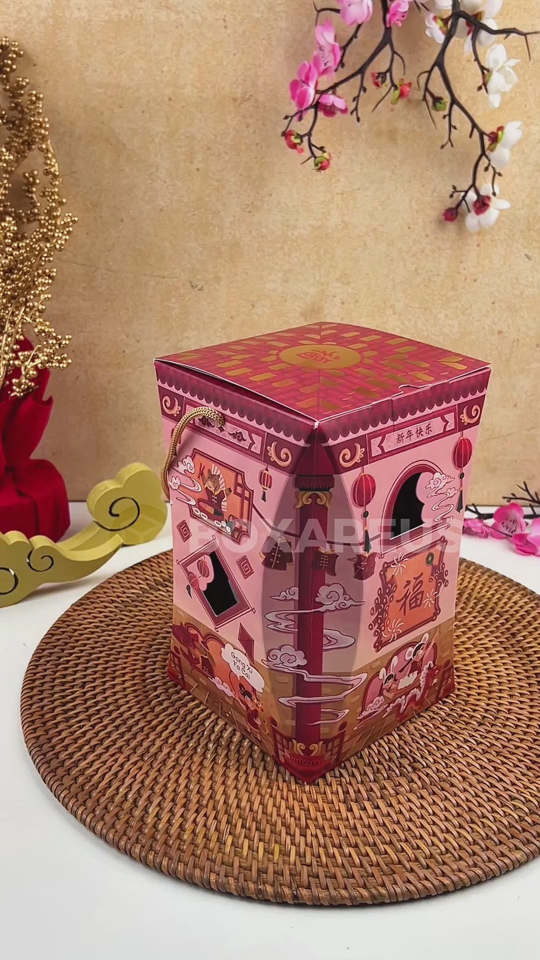 Kemasan hampers serbaguna dengan bentuk dan ilustrasi desain yang unik, bertekstur matte, dan terdapat sentuhan gold foil pada bagian tutup membuat packaging semakin elegan dan premium. Dilengkapi tali sehingga mempermudah saat membawa hampers. Jendela berlubang untuk memperlihatkan produk di dalam. Desain tema apartemen zodiac, membangkitkan nuansa persiapan Imlek yang ramai dan ceria.