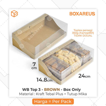 Window Box ini cocok untuk mengemas 3 toples persegi 350gr (hardtop 901 atau
